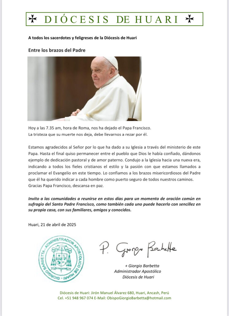 A todos los sacerdotes y feligreses de la Diócesis de Huari